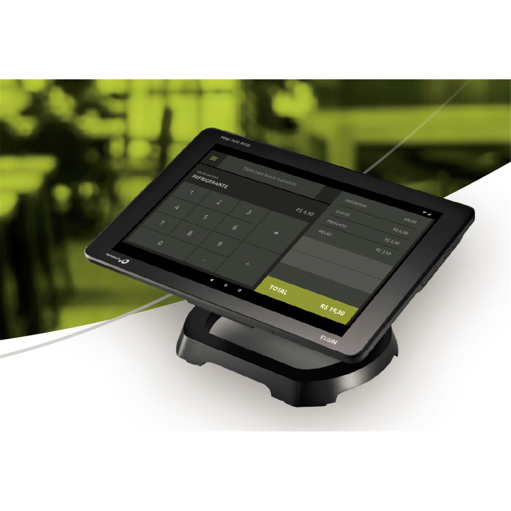 | MINI PDV M10 - PONTO DE VENDA COMPACTO Compacto e Funcional. O Mini PDV M10 é um All in One Android compacto que tem tudo que pequeno e médio varejo precisa para frente de caixa com ótimo custo-benefício: Impressora Inclusa, interfaces para conexão de periféricos, tela Touch Screen e liberdade para escolher o software de automação (*verificar parceiros homologados). Equipamento robusto, com design elegante, tela de 10 polegadas e muitas conexões disponíveis. Utilize o Mini PDV M10 em diversos segmentos do varejo e integre ao equipamento o software de automação comercial de sua preferência. Especificação: PROCESSADOR: Arm mali400 mp2 500mhz SISTEMA OPERACIONAL: Android 7.0 MEMÓRIA RAM E ARMAZENAMENTO: 2GB / 16GB EXPANSÃO DE MEMÓRIA: 32GB TELA TOUCHSCREEN: Capacitiva RESOLUÇÃO DA TELA: 800 x 1280 pixels ÁUDIO:Alto falante, Microfone WLAN: 802.11 b/g/n, 2.4G TAMANHO DA TELA: 10 pol. BLUETOOTH: Ver 4.0 CONEXÃO USB 2.0: 5 portas CONEXÃO ETHERNET 10/100: 1 porta A-GPS: Yes IMPRESSORA: Diâmetro máximo da bobina: 48mm, Largura máxima da bobina: 57mm, Guilhotina: Corte total e parcial, Largura máxima de impressão: 48mm CONEXÃO USB 2.0: 5 portas CONEXÃO SERIAL: 1 porta Rj45 CONEXÃO PARA GAVETA DE DINHEIRO: 1 porta Rj11 BATERIA:Lithium-Ion Recarregável, 7,4V/2500mAh TEMPO DE CARGA TOTAL: 1h 30min FONTE DE ALIMENTAÇÃO: Entrada 100 ~240VAC / Saida 9VC -4A TEMPERATURA DE TRABALHO: 5° a 45°C DIMENSÕES (L X A X P)MM: 260 x 145 x 180 PESO: 1320g GARANTIA: 12 meses |